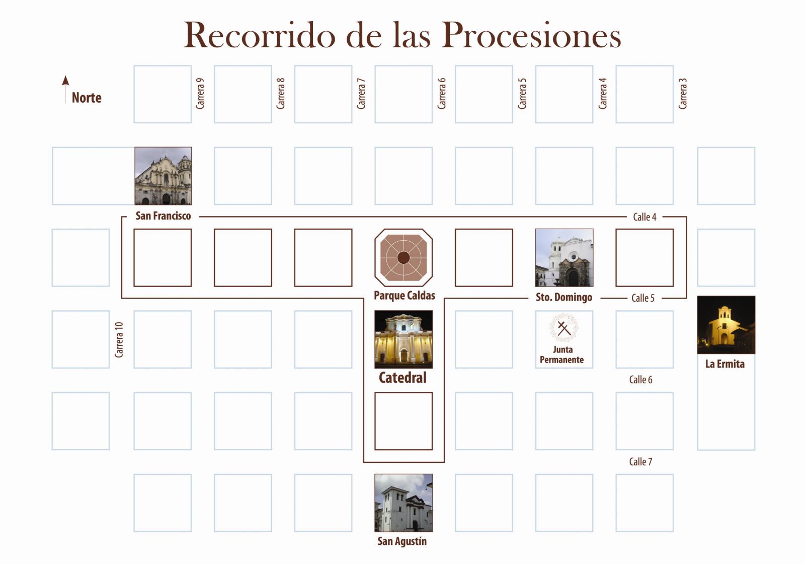 Este es el recorrido de los Pasos en las procesiones de la Semana Mayor en la capital caucana del 15 al 19 de abril del 2014, en el centro histórico de la ciudad, que todos los años se ha tenido en cuenta.