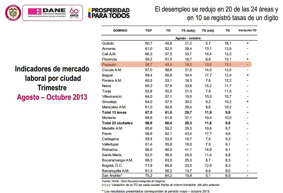 Según el último estudio de indicadores de mercado laboral por ciudad que realiza trimestralmente el Departamento Administrativo Nacional de Estadística (Dane), entidad responsable de la planeación, levantamiento, procesamiento, análisis y difusión de las estadísticas oficiales de Colombia, la ciudad de Popayán bajó al quinto lugar con una tasa de 13,1%.
