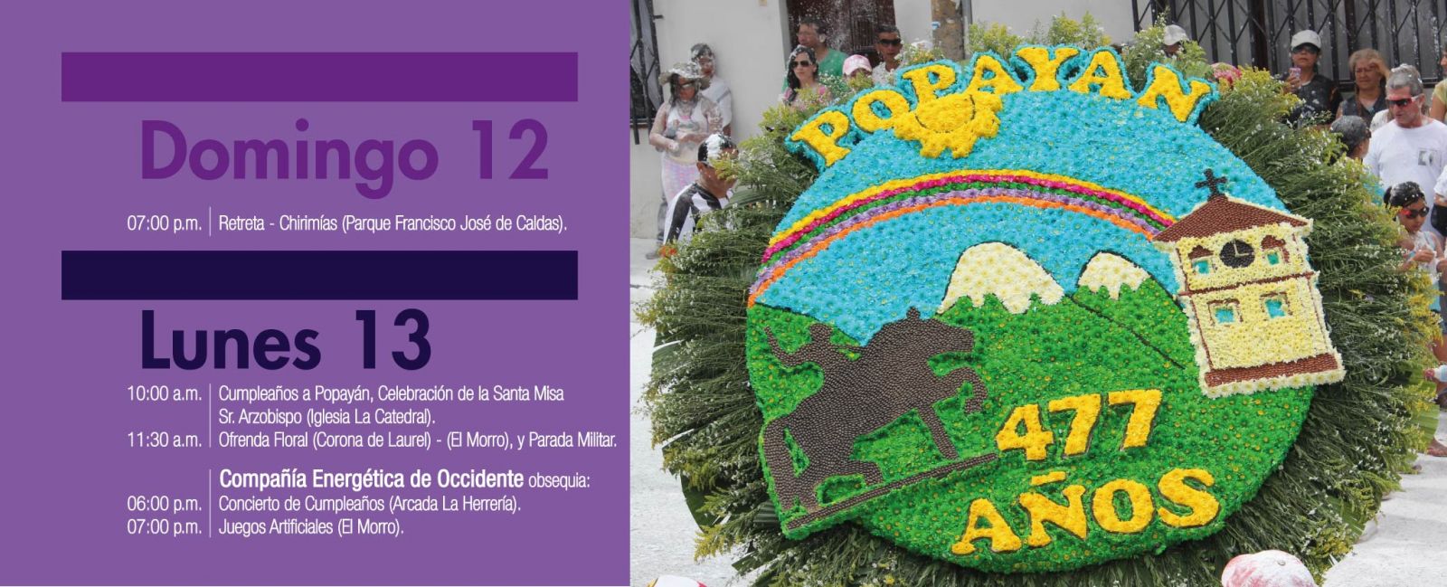 Con una variada programación (eucaristía, parada militar, concierto y juegos pirotécnicos) la Administración Municipal en cabeza del señor alcalde, Francisco Fuentes Meneses, con el auspicio de la Compañía Energética de Occidente, se celebrarán los 477 años de fundación de Popayán, el próximo lunes 13 de enero.