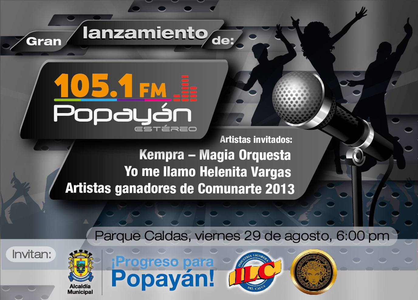 Este viernes 29 de agosto a partir de las 6 de la tarde en el parque Francisco José de Caldas, el Alcalde Francisco Fuentes Meneses y los Secretarios de Despacho realizan el lanzamiento oficial de la Emisora 105.1 FM Popayán Estéreo.